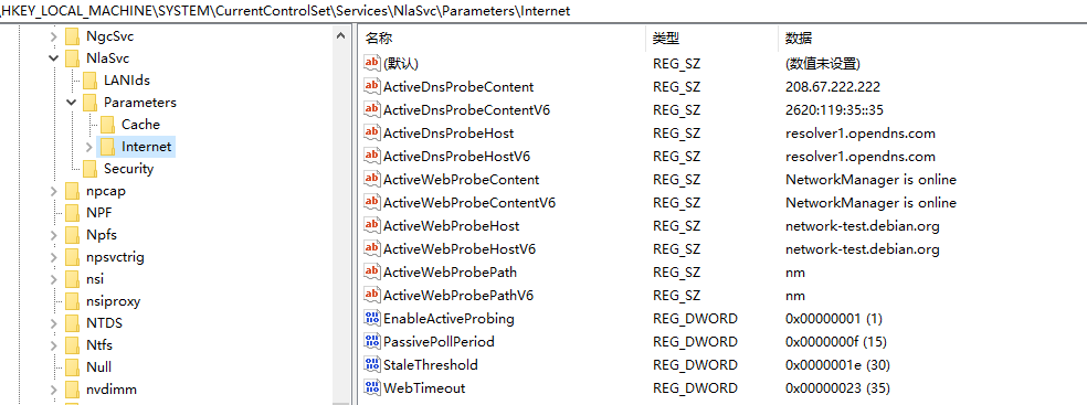 其中,HKEY_LOCAL_MACHINE\SYSTEM\CurrentControlSet\Services\NlaSvc\Parameters\Internet 这一项,我的设置和默认值不同,其值如下图,因为所处网络不同所以这里稍有改动,第二节会提到。